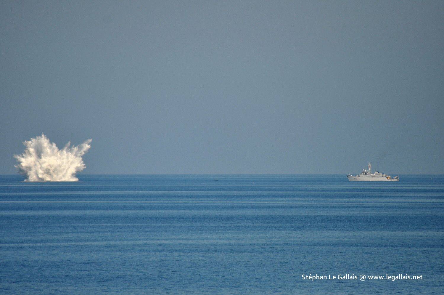 Bastia pendant la dernière guerre (39/45) a été le théâtre de nombreux bombardements américains mais aussi torpillages par des sous-marins (Dzik HMS P-52,HMS Saracen, …). Après la découverte en 2011 de deux torpilles Anglaise, il semblerait que l’armée soit tombé sur trois mines américaines (-60 m) de la WW2 au large de la Citadelle de Bastia. Les chasseurs de mines Orion et Pluton étaient sur zone ce mardi matin pour déplacer puis pétarder une des mines. C’est après relevage de la mine en surface puis tracté par un navire qu’elle fût détruite par les Plongeurs Démineurs à l’aide d’explosif. A 18H50 une belle gerbe en attesté.