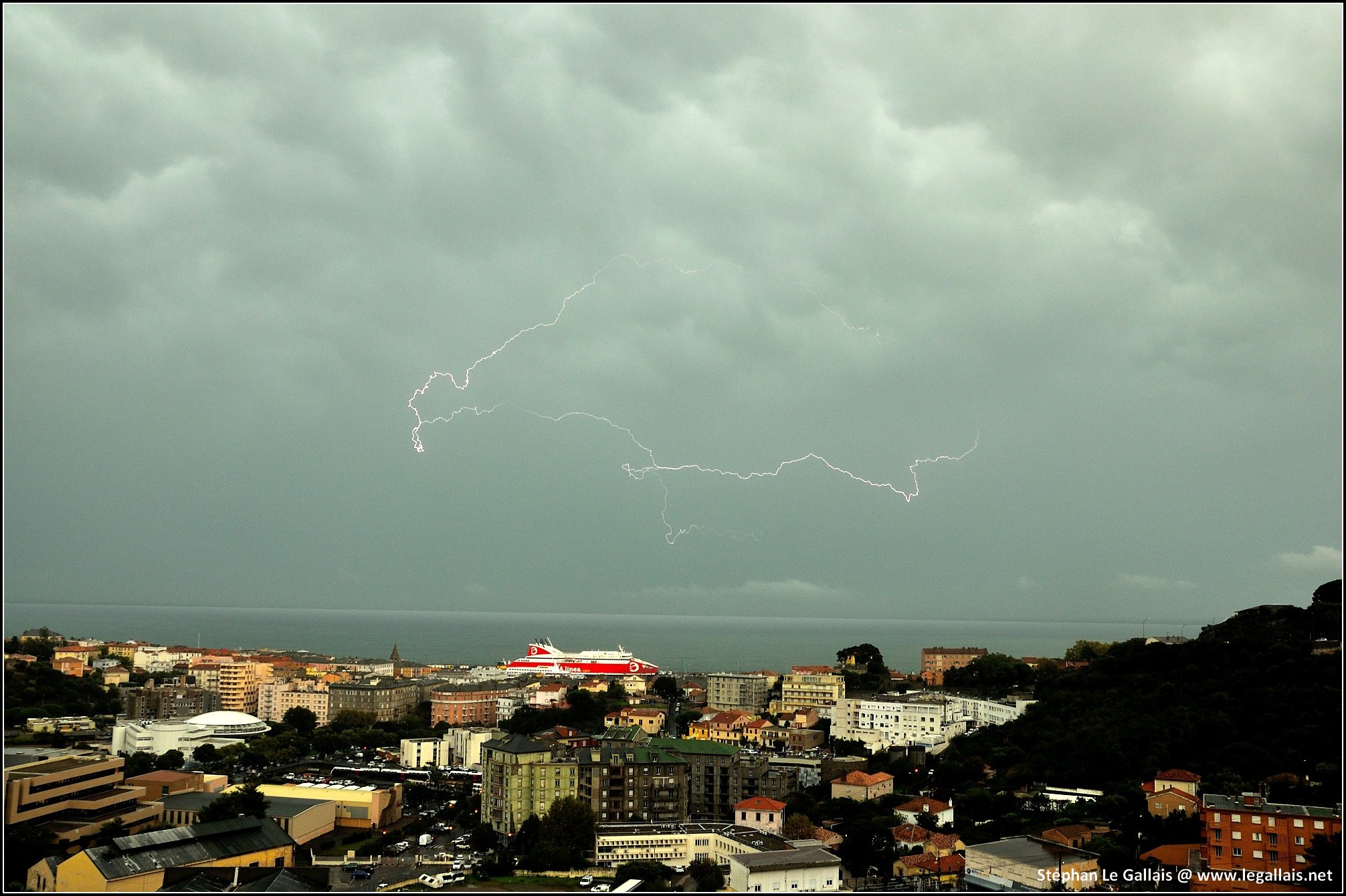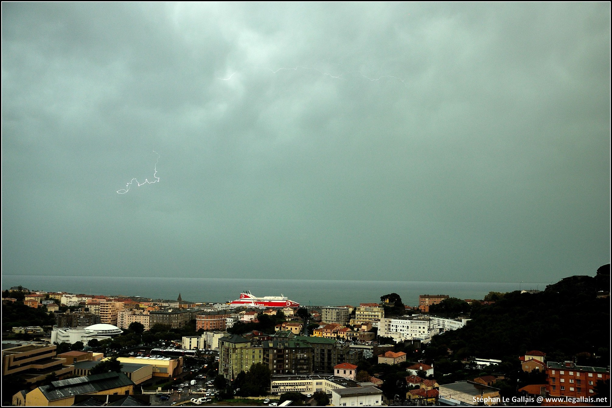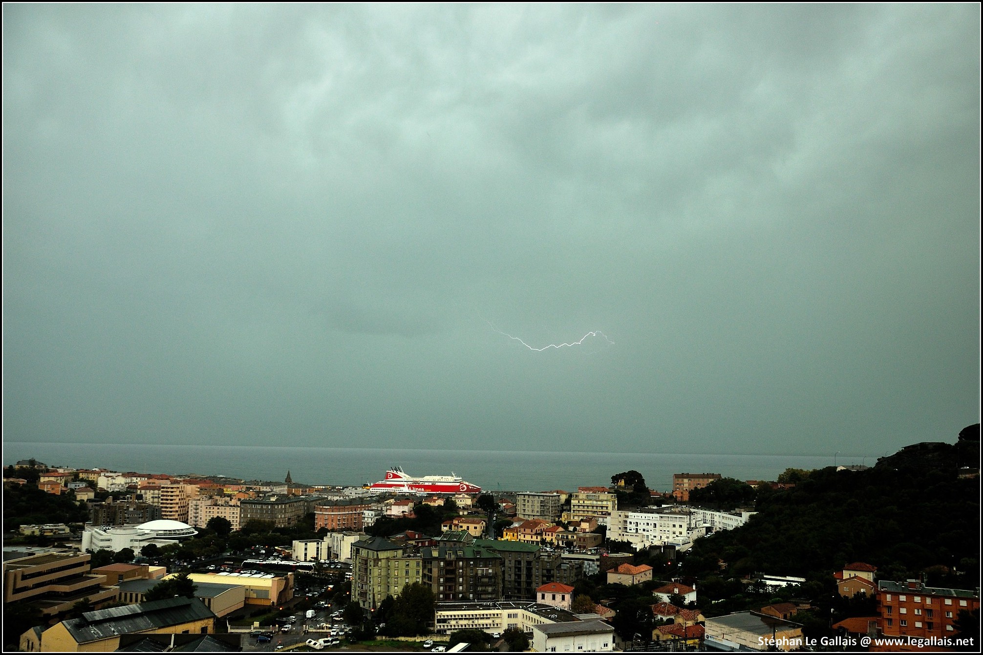 Alors que Météo France nous avait placé juste en vigilance Jaune, un épisode de forts vents, pluie a balayé la Corse de l’Ouest vers l’Est. Une mini tornade a détruit une partie du Chapiteau installé à Ajaccio pour la Marie-Do, des pluies très intenses ont traversé l’Ile. En ce qui me concerne, je voulais saisir quelques éclairs, et donc équipé de mon matériel je suis allé chez un ami qui a une vue dégagé.