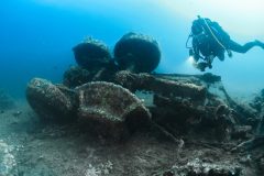 Les amateurs de tôles apprécieront cette plongée sur ce camion DUKW 353, il repose dans la baie de Cavalaire par une vingtaine de mètre. Un deuxième se trouve à quelques centaines de mètres aussi. Le camion est bien reconnaissable par son double essieu à l’envers.
