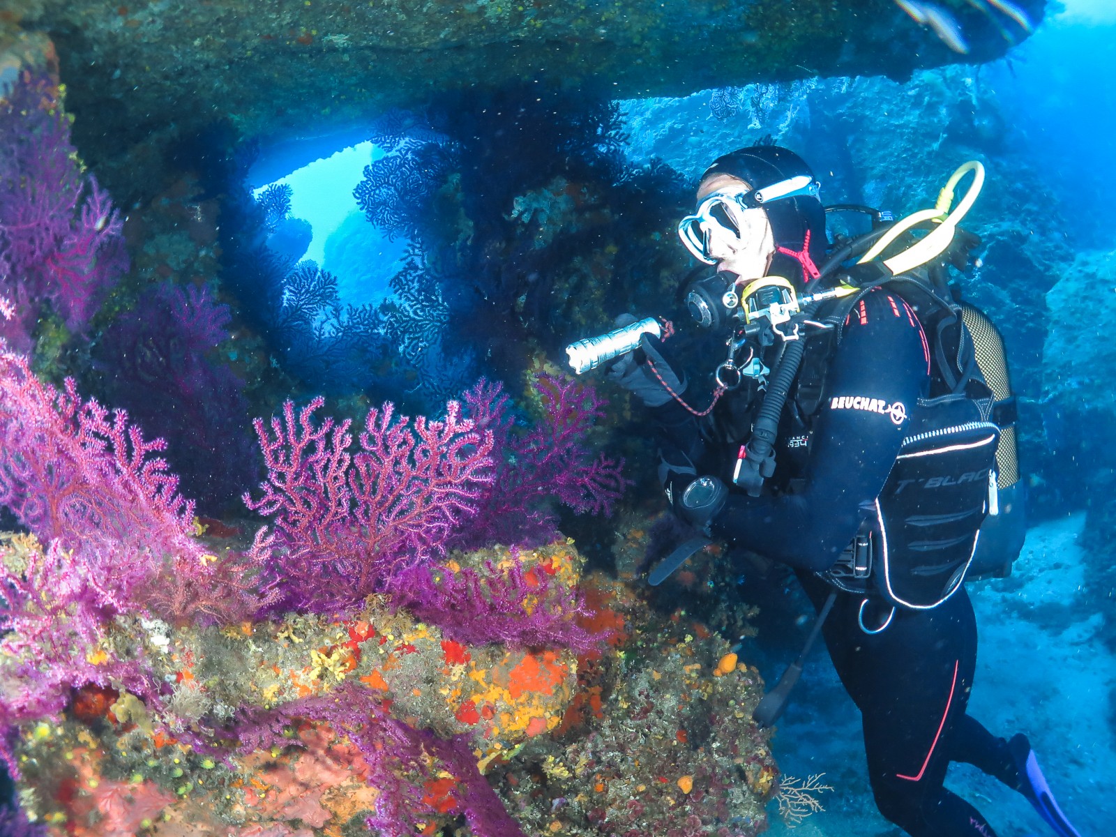 Je n’étais plus revenu dans le golfe du Valinco depuis les confinements successifs et cela me manquait. J’avais entendu dire que les gorgones pourpres avaient souffert du réchauffement climatique et je m’attendait à une catastrophe, mais au final à partitr d’un trentaine de mètres, on retrouve bien ces forets pourpres. J’étais accompagné d’Audrey qui m’a servi de modèle pour shooter ces merveilleux paysages sous-marins.