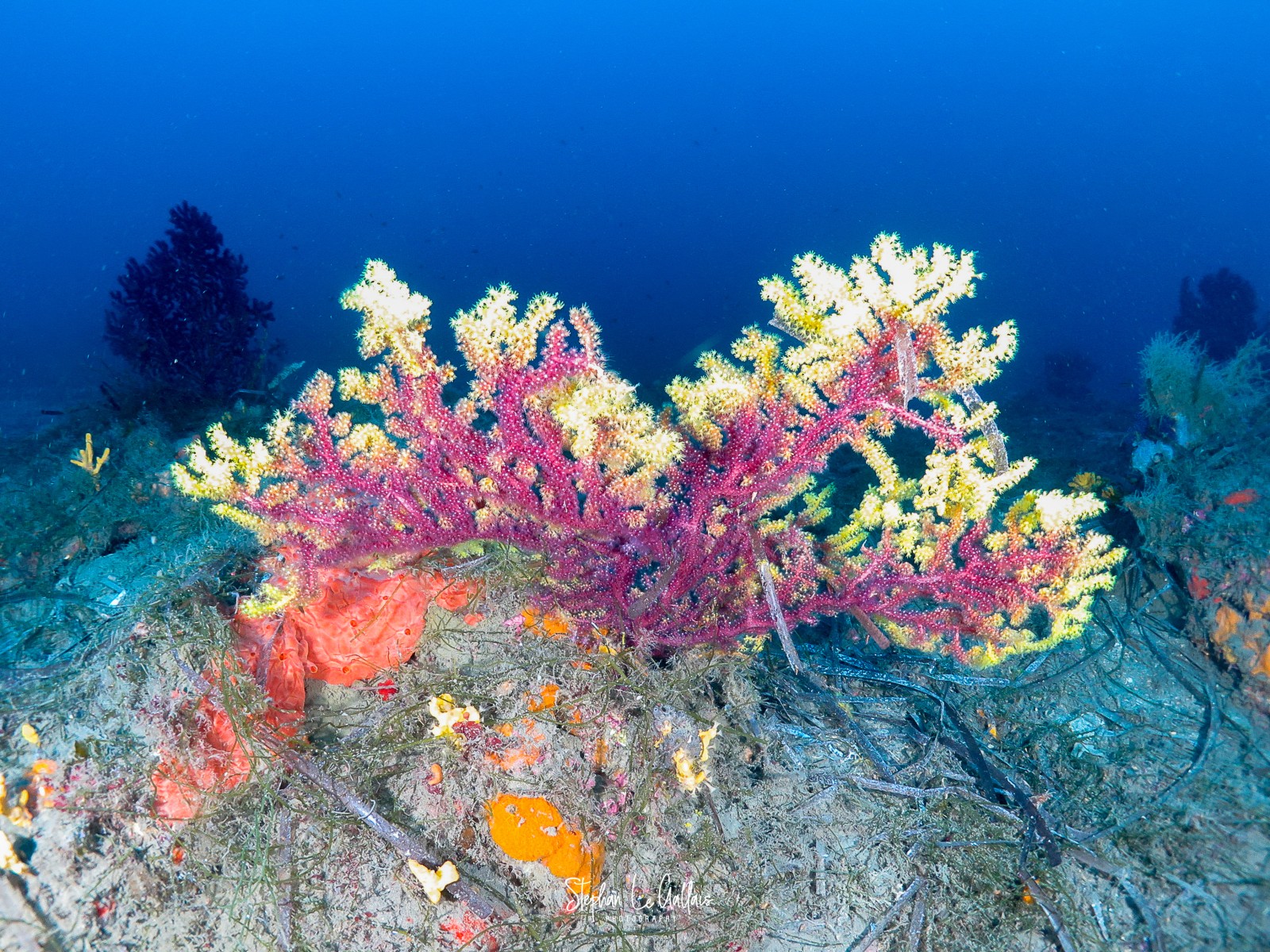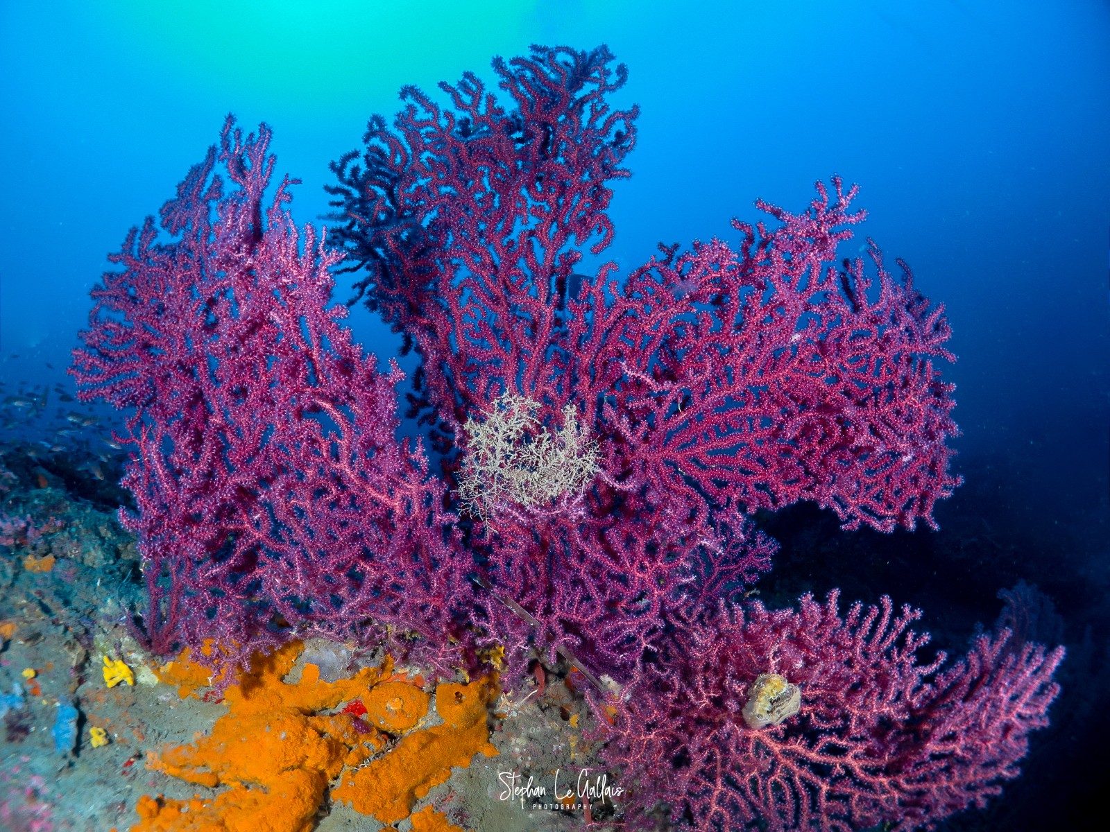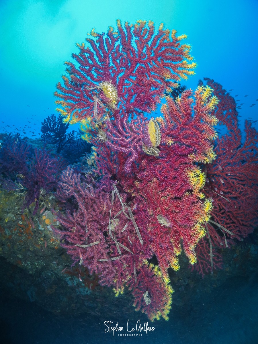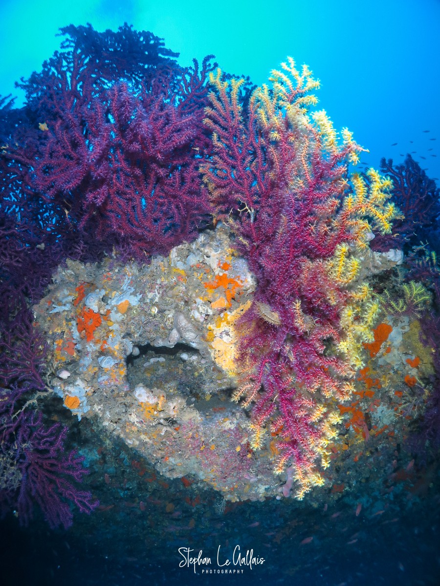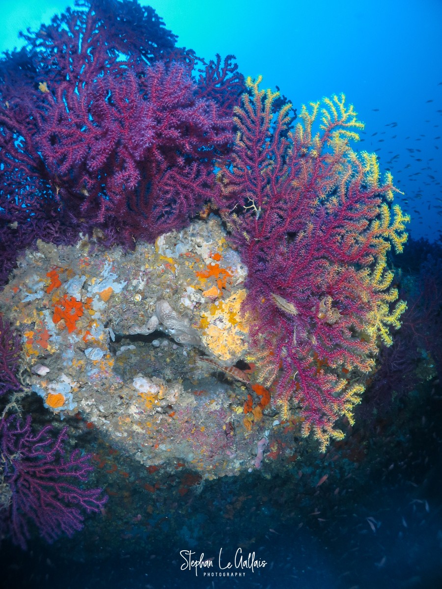 Toujours un réel plaisir de plonger sur cette roche devant le port de commerce de Bastia. Elle est couverte en partie de gorgones pourpre et mimosa (bout jaune). Chaque année les gorgones sont différentes, ou plutôt en fonction des saisons, on a l’impression qu’elles se meurent et puis l’hiver, elles reprennent force et vigueur. Cette sortie était organisé par Toga Plongée.