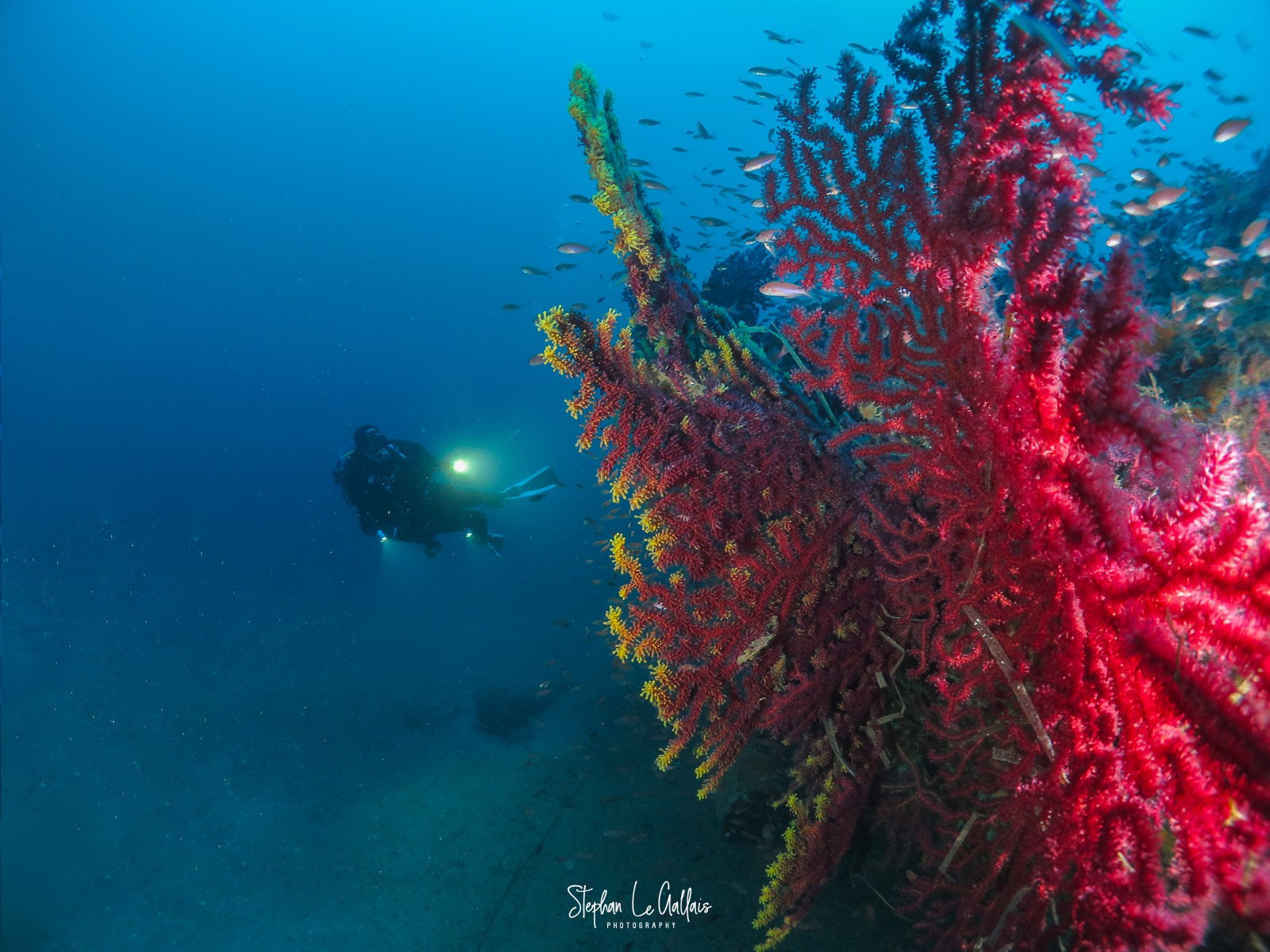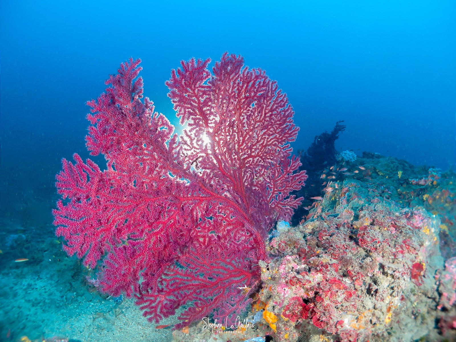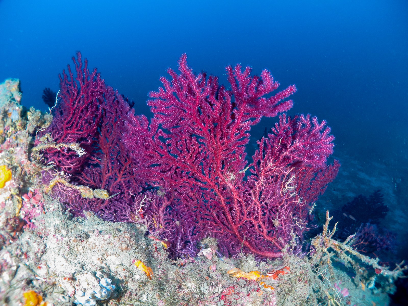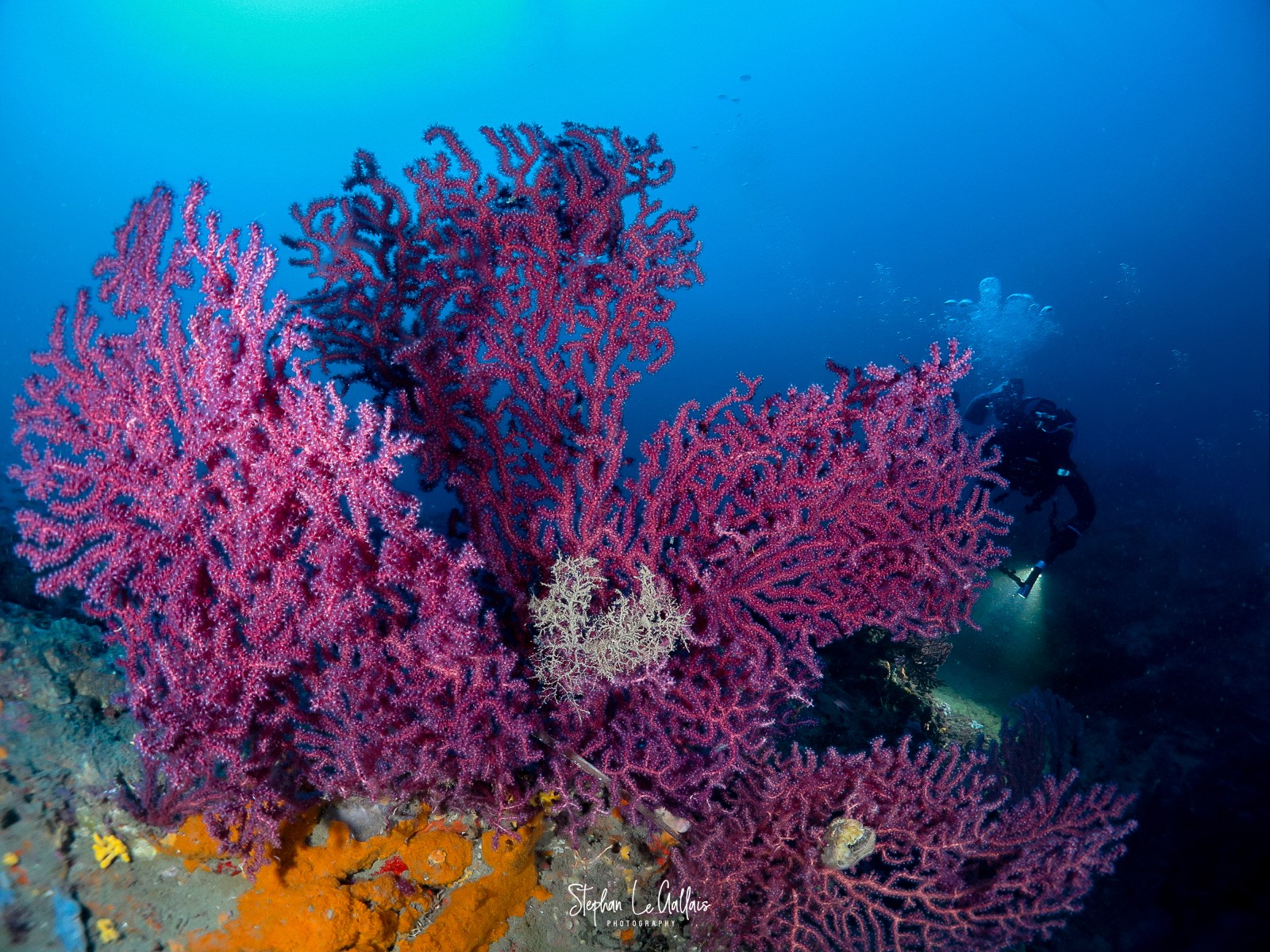 Toujours un réel plaisir de plonger sur cette roche devant le port de commerce de Bastia. Elle est couverte en partie de gorgones pourpre et mimosa (bout jaune). Chaque année les gorgones sont différentes, ou plutôt en fonction des saisons, on a l’impression qu’elles se meurent et puis l’hiver, elles reprennent force et vigueur. Cette sortie était organisé par Toga Plongée.